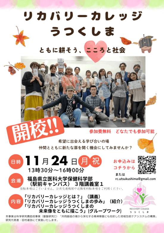 内容:①リカバリーカレッジの説明 ②リカバリーカレッジうつくしまの歩みの紹介 ③リカバリーカレッジうつくしまの未来像をともに描こう(グループワーク)
