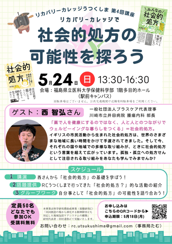 5月24日(日)「社会的処方」の著者・西智弘さんがRCうつくしまに来てくださいます